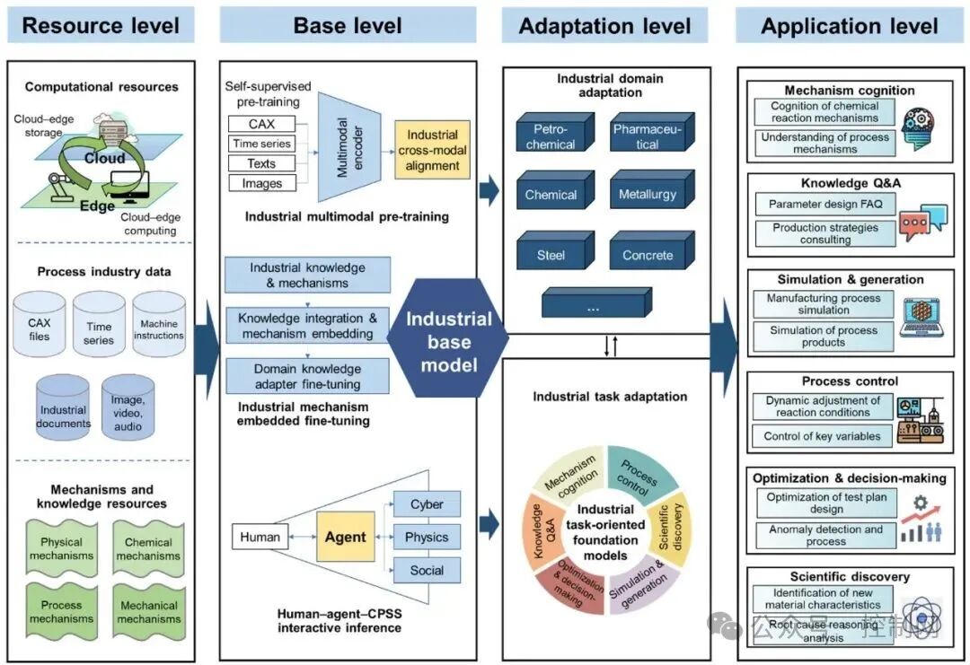 应用层推动场景落地:将基础模型转化为主动感知、自主决策的工业智能体。这些智能体能够实现实时过程控制、智能优化等核心功能,通过CPSS系统实现人机高效协同,为流程工业提供从生产操作到经营决策的全栈式智能服务,如图2所示。