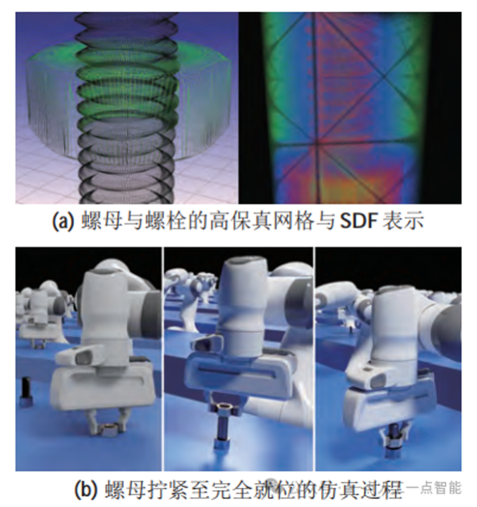 NVIDIA公司提出了一套可用于机器人拧紧过程的模拟方法Factory[382],通过结合符号距离场(SDF)碰撞检测技术和高斯-赛德尔求解器,实现了对复杂场景的高效、准确模拟,如图28所示。Factory能够大幅降低接触数量,在单个GPU上实时模拟1000个螺母-螺栓交互(约为现有方法单对交互模拟速度的20倍)。