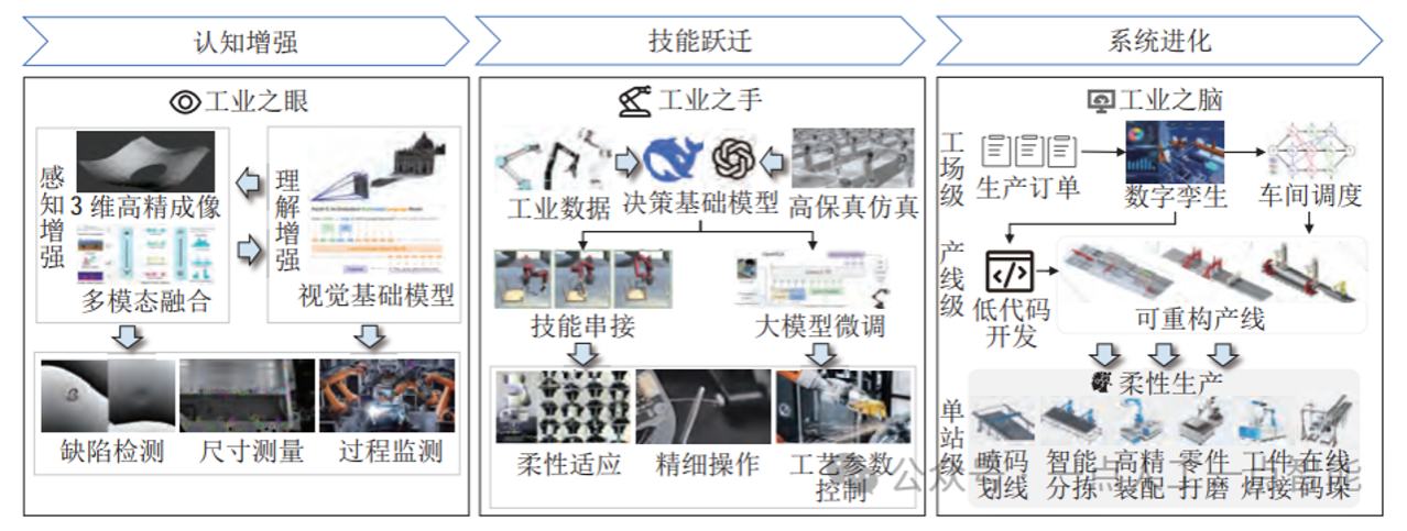 现有研究沿着“工业之眼—工业之手—工业之脑”呈阶梯式耦合,可抽象为柔性制造场景下具身智能的“认知增强—技能跃迁—系统进化”三阶段演进路径。